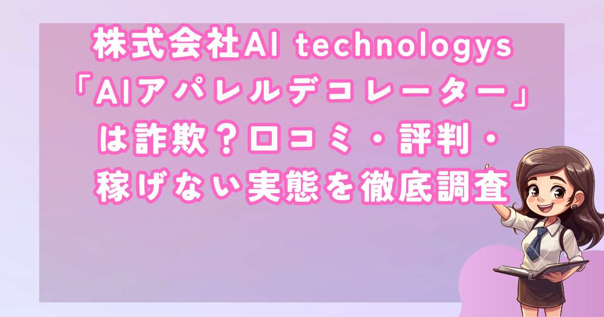 副業や投資の分野で話題となっている株式会社AI technologysの「AIアパレルデコレーター」ですが、ネット上では「詐欺ではないか」「本当に稼げるのか」といった疑念や悪評が絶えません。