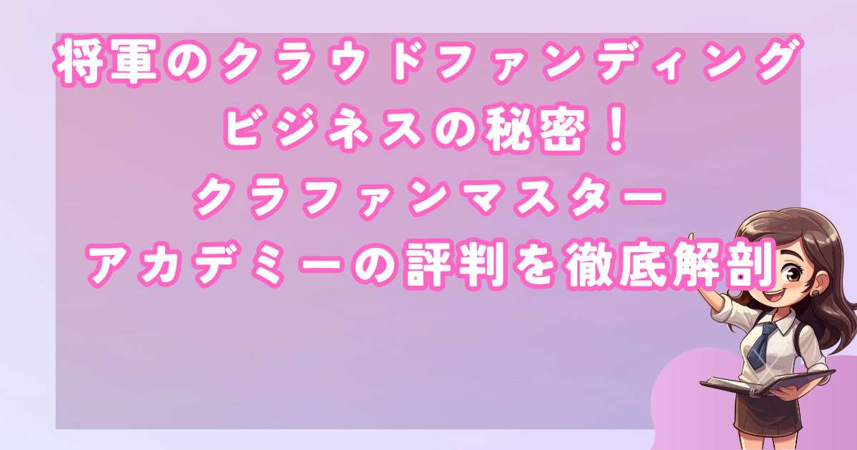 将軍(加藤将軍)が展開するクラウドファンディングビジネスおよび「クラファンマスターアカデミー」は、「誰でも簡単にクラウドファンディングで大きな利益を得られる」とうたう副業案件です。