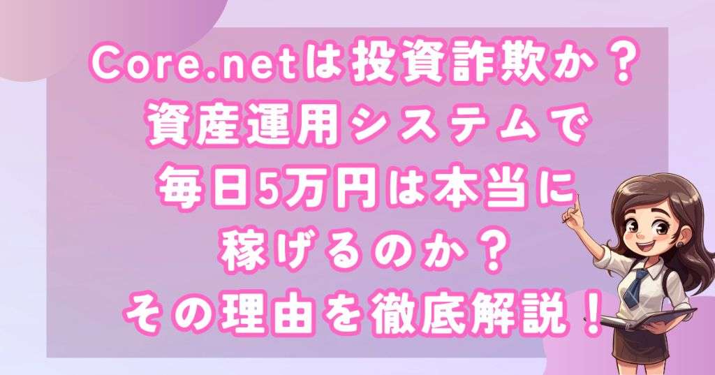 このように、Core.netは資産運用システムとして位置づけられていますが、投資の具体的な対象や運用方法の詳細が明らかにされていない点、また毎日安定して高利益を約束する点については、現実的でないと考えられます。