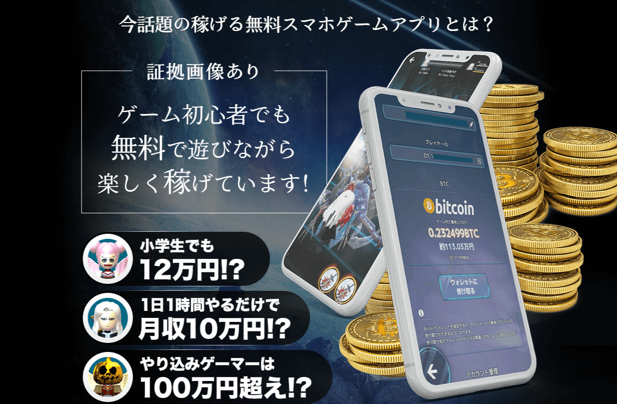 ゲーム初心者でありながら無料で稼げるとのことで、1日1時間でも月に10万円を、さらにやりこむことで100万円以上稼げたり、小学生でも12万円稼いでいるなど、気になる文言が並んでいます。