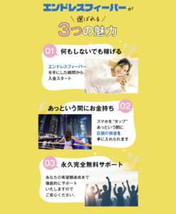 LPには、「エンドレスフィーバーが選ばれる3つの魅力」という項目も見られます。