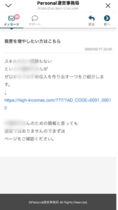 「Personal運営事務局」という名称になっているのが不審です。ウェブサイトとなっており、メルマガのような形でメールが配信されています。試しに一つ開いてみると、次のような案内となっていました。