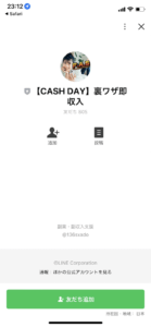 F.A.S(Free Agent Society)のLINE公式アカウントは上記画像の通りで、「【CASH DAY】裏ワザ即収入」という名称で運営されています。もはやF.A.S(Free Agent Society)のLINEなのかすらも疑いたくなるような名称ですね。とりあえず追加してみると、さっそく次のような案内が送られてきます。