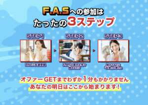 F.A.S(Free Agent Society)では、上記画像の通り3ステップでお金を稼げると案内があります。