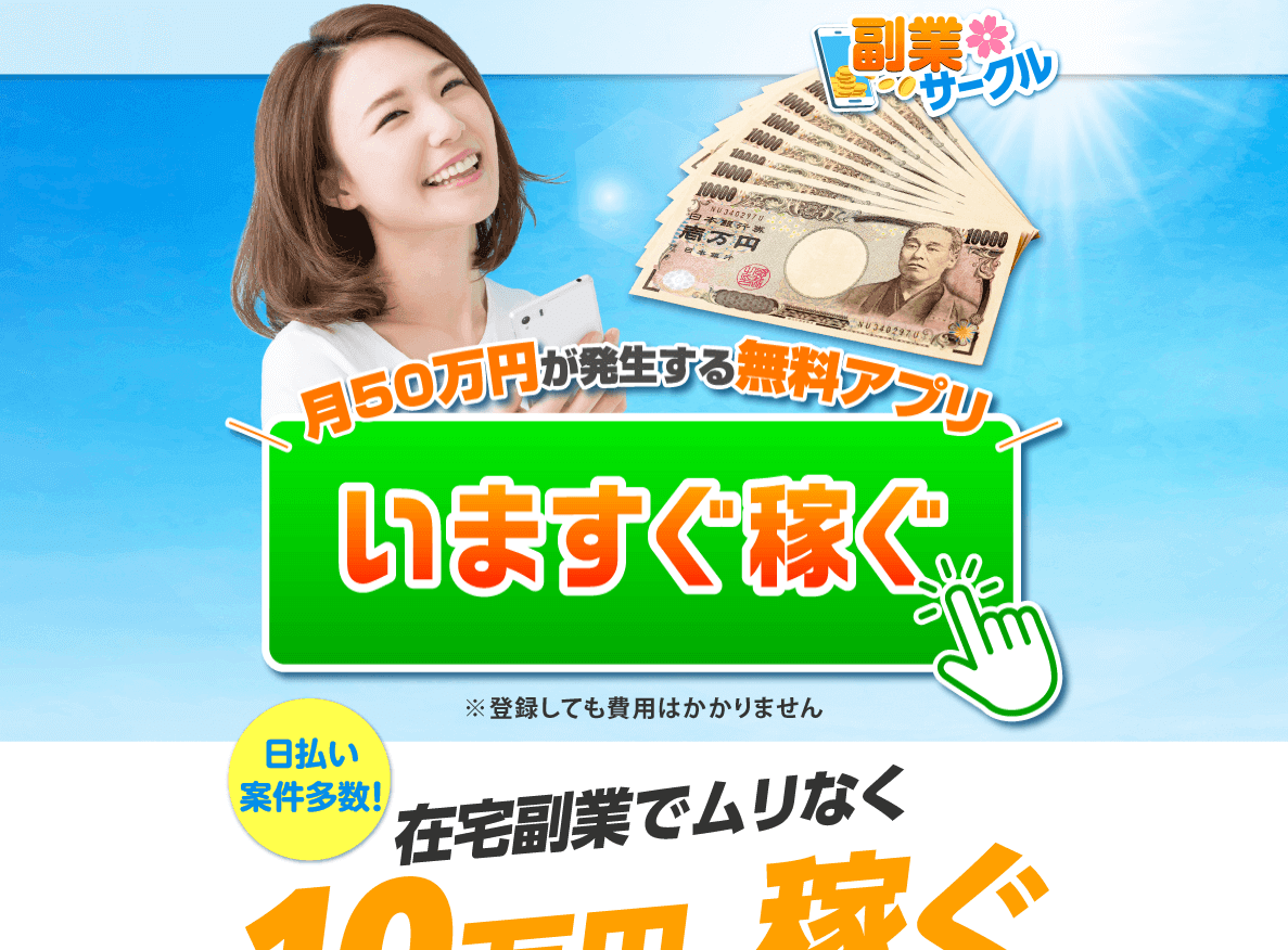 在宅副業でムリなく10万円を稼げるとの記載や、月50万円が発生する無料アプリとの記載もあります。