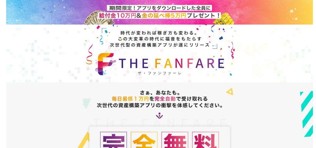 メールアドレスを入力し、公式LINEを登録してから「ザ・ファンファーレ」をダウンロードするだけで、毎日1万円が継続的に稼げるとされています。