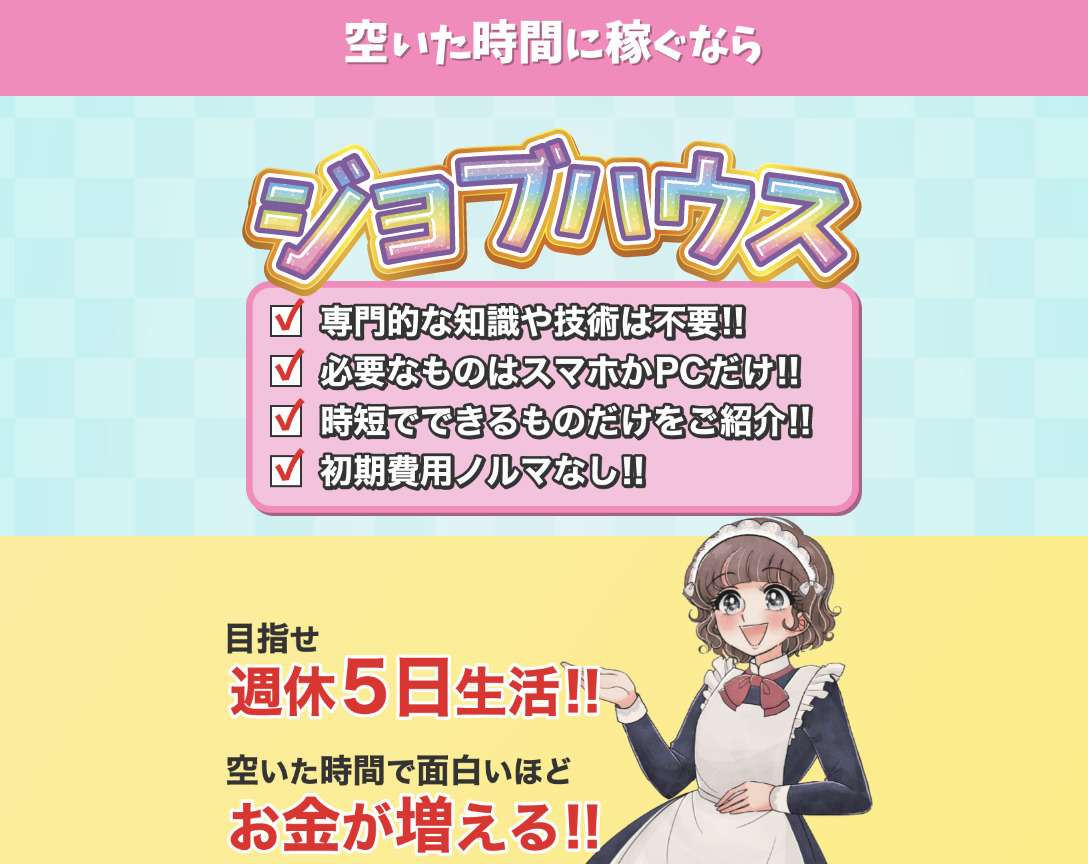 「ジョブハウス(JOB HOUSE)」は不正なオプトインアフィリエイトを行うためだけのサービスであり、お金を稼ぐことはできません。LPでは「週休5日生活」という内容を宣伝していますが、明らかに誇大広告であることが判明しています。