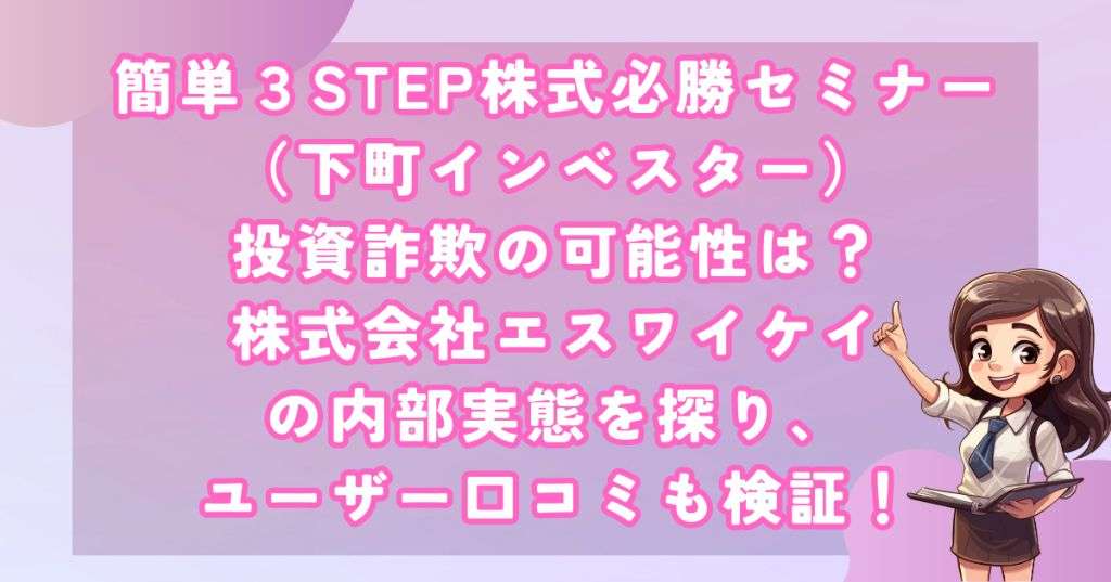 下町インベスターが提供する「簡単3STEP株式必勝セミナー」が、悪質な高額塾の疑いがあるとの指摘があります。