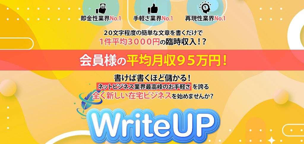 ライトアップ(WriteUP)は、たった20文字の短文を書くだけで、平均3,000円の報酬を得られるという新しいビジネスモデルを採用しています。