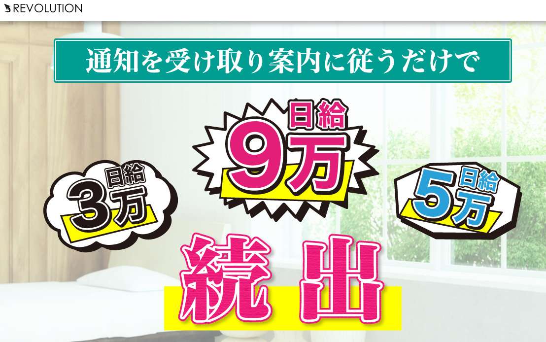 革命を意味する言葉ですが、通知を受け取って案内に従うだけで日給3万円、さらにはそれ以上も狙えるとのこと。