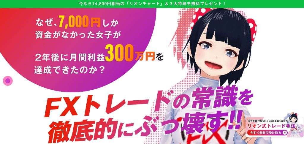リオン式トレード手法についての詳細を調査しました。この手法は、わずか7,000円の初期投資から月間300万円を目指すと主張しています。