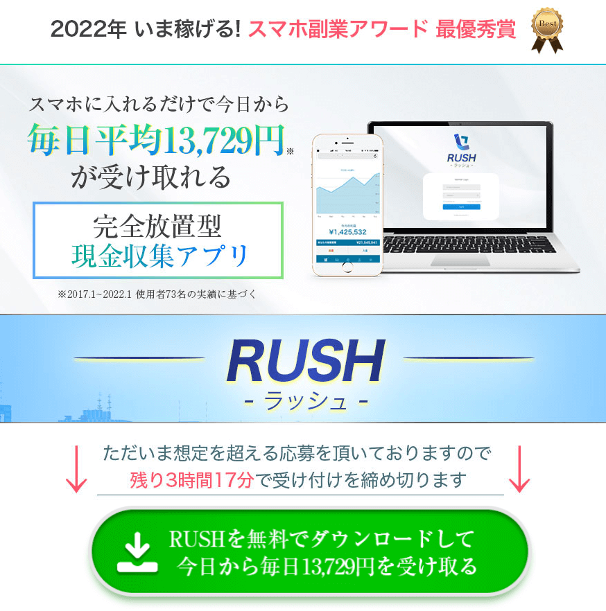 ラッシュによると、2022年スマホ副業アワードにて最優秀賞を受賞したとのことですが、この「スマホ副業アワード」なるものが不明瞭です。