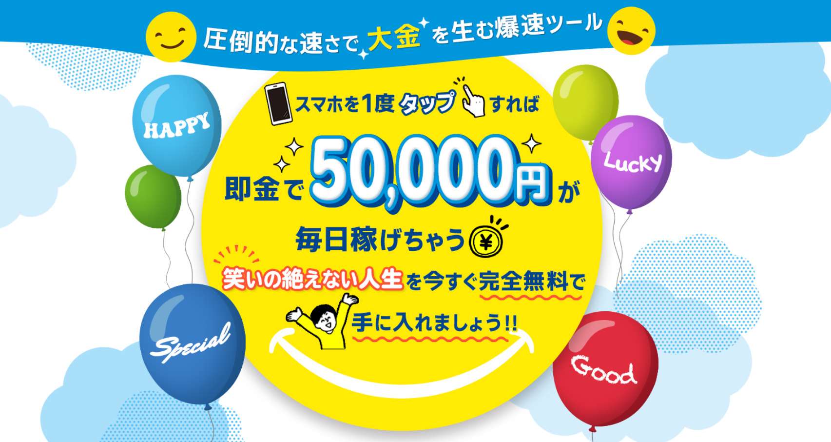 「SUPER SMILE」は、「スマホを1度タップすれば即金で50,000円が毎日稼げちゃう」と謳っており、完全無料で始められるサービスとのこと。