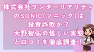 副業株式会社ワンダーリアリティのSONIC(ソニック)は投資詐欺か?大川智宏の怪しい実態と口コミを徹底調査! 皆さんこんにちは!河口です! 今回は「SONIC(ソニック)」という商材を紹介します。 会社概要について ... 2024.09.23副業