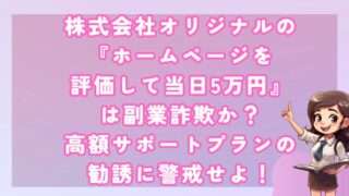 副業株式会社オリジナルの『ホームページを評価して当日5万円』は副業詐欺か?高額サポートプランの勧誘に警戒せよ! 皆さんこんにちは!河口です! 今回は株式会社オリジナルの提供する副業、「ホームページ評価で当日5万円稼ぐ」... 2024.11.08副業