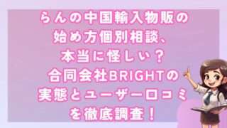 副業らんの中国輸入物販の始め方個別相談、本当に怪しい?合同会社BRIGHTの実態とユーザー口コミを徹底調査! 皆さんこんにちは!河口です! 今日は、中国輸入物販に関する個別相談の副業を調査しました。 こ... 2024.10.24副業