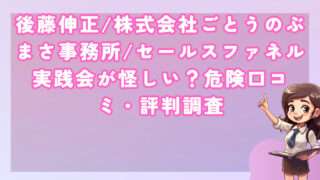 投資後藤伸正/株式会社ごとうのぶまさ事務所/セールスファネル実践会が怪しい?危険口コミ・評判調査 皆さんこんにちは!河口です! インターネットビジネスの世界で注目を集めている後藤伸正氏ですが、その活動内容について疑問... 2025.12.07投資
