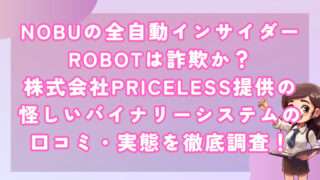 副業NOBUの全自動インサイダーROBOTは詐欺か?株式会社PRICELESS提供の怪しいバイナリーシステムの口コミ・実態を徹底調査! 皆さんこんにちは!河口です! NOBU氏が提供する、スマホ1台でワンタップするだけで収益を上げ続けられるとされるF... 2024.07.14副業