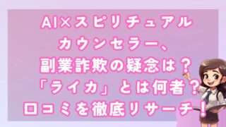 副業AI×スピリチュアルカウンセラー、副業詐欺の疑念は?「ライカ」とは何者?口コミを徹底リサーチ! 皆さんこんにちは!河口です! 本日は「AI×スピリチュアルカウンセラー」という副業案件を調査しましたが、結... 2024.12.12副業