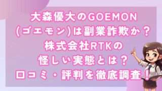 副業大森優大のGOEMON(ゴエモン)は副業詐欺か?株式会社RTKの怪しい実態とは?口コミ・評判を徹底調査! 皆さんこんにちは!河口です! 今回は、ゴエモンという案件について解説します。 これは株式投資に似た案件の... 2024.07.18副業
