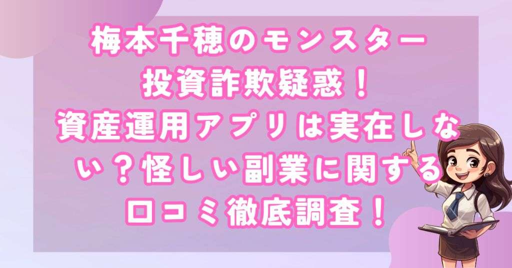 調査の結果、Monsterというアプリ自体が実在せず、単なるブラウザ上のサイトのようなものであることが判明しました。また、梅本千穂という人物も実在しない可能性が高く、ただの役者かもしれません。
