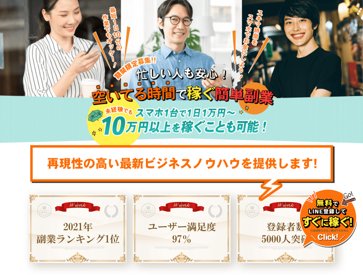 スマホ1台あれば、空いている時間で1日1万円以上が可能で、10万円以上も狙えるとのこと。