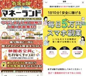 「現金獲得キャンペーン」「平均日給5万円超えの副業」など、本当に関係があるのか怪しい内容になっています。