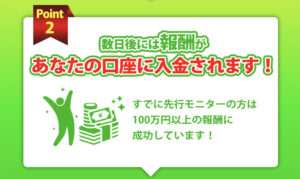 数日後には報酬が入金されるとのことですが、具体的な仕組みについてはいっさい説明がありません。そもそも「100万円以上の報酬」など現実的ではない話が多いです。「なぜ稼げるのか」「どこから支払われるのか」などが不明瞭なので、誇大広告と言えるでしょう。