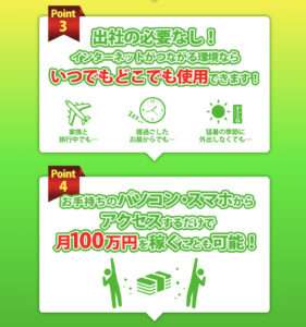 「どこでもできる」「アクセスするだけで」といった内容も、悪質なサービスによくある誇大広告です。明らかに都合の良いことばかりが記載されており、あたかも何もせずに100万円が貰えるような案内をしています。