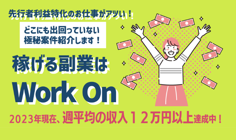 ワークオン(Work On)は、どこにも出回っていない極秘案件を紹介する副業として紹介されている怪しいオファーです。週平均で12万円以上稼げるといった誇大広告のような表現もあるため、詐欺である可能性も考えられます。そこで本記事では、ワークオン(Work On)の正体を調査し、怪しいポイントについてまとめました。もっと知りたい方は、ぜひ最後までご覧ください。
