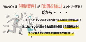 ワークオン(Work On)では、「1日たった15分のスマホ作業で最高毎日の即金収入に!」と案内があります。つまり、紹介される副業案件はすべてスマホでできる内容ということでしょうか。